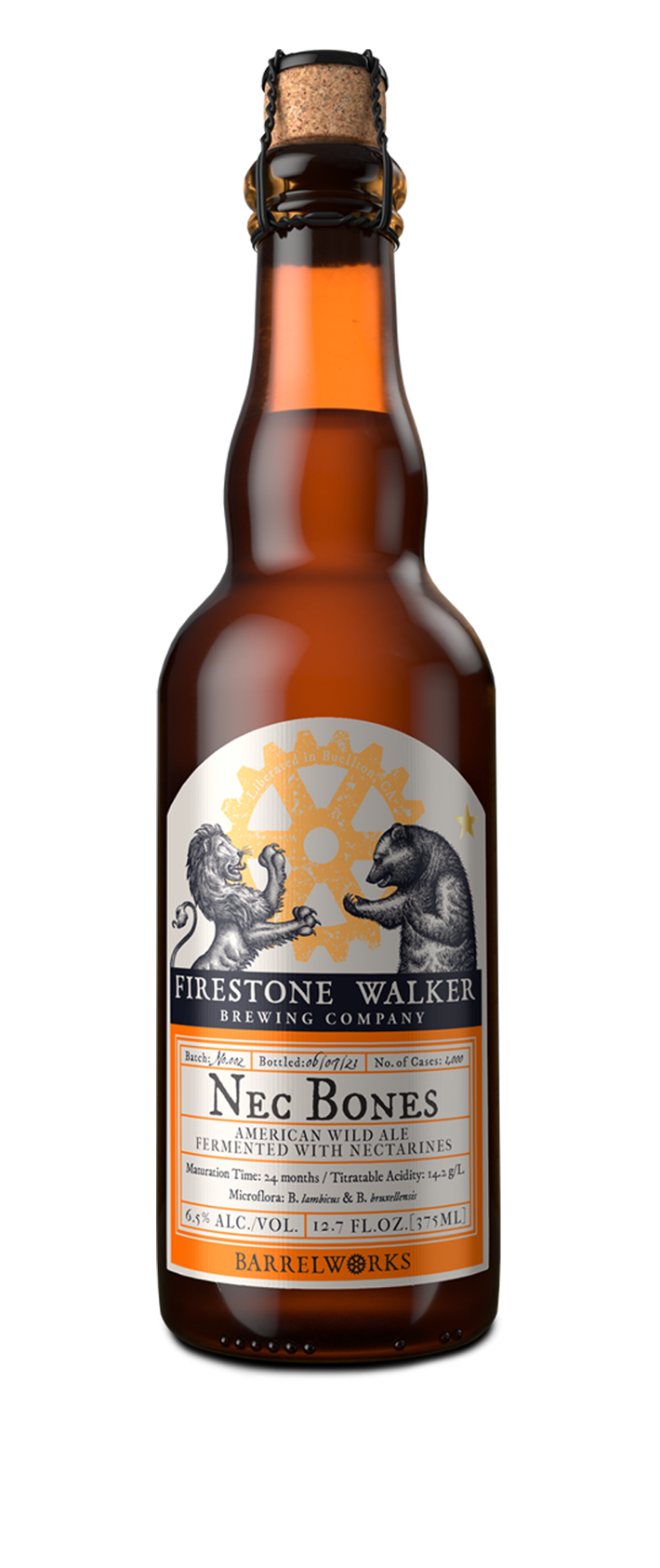 Welcome to our second offering of Nec Bones. 3000 lbs of Honey Fire Nectarines grown in our backyard of Paso Robles by the Rydell Family of Fair Hill Farms were once again chosen and delivered whole to Barrelworks Buellton. Once hand processed and pitted, the nectarines were added to our French Oak Foeder and topped up with a blend of 18-24 month old oak fermented propriety base beer. After aging one year on this fruit we added another 2000 lbs of fresh nectarine puree from Wawona Farms to the tank and let things ride for another 6 months, making this the most heavily fruited batch of Nec Bones to date.
