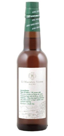 The regular NV Amontillado has an average age of 12 years, six years under flor, and then it was fortified to 17.5% alcohol and aged in an oxidative way. It feels bone dry. The price is for a half bottle.