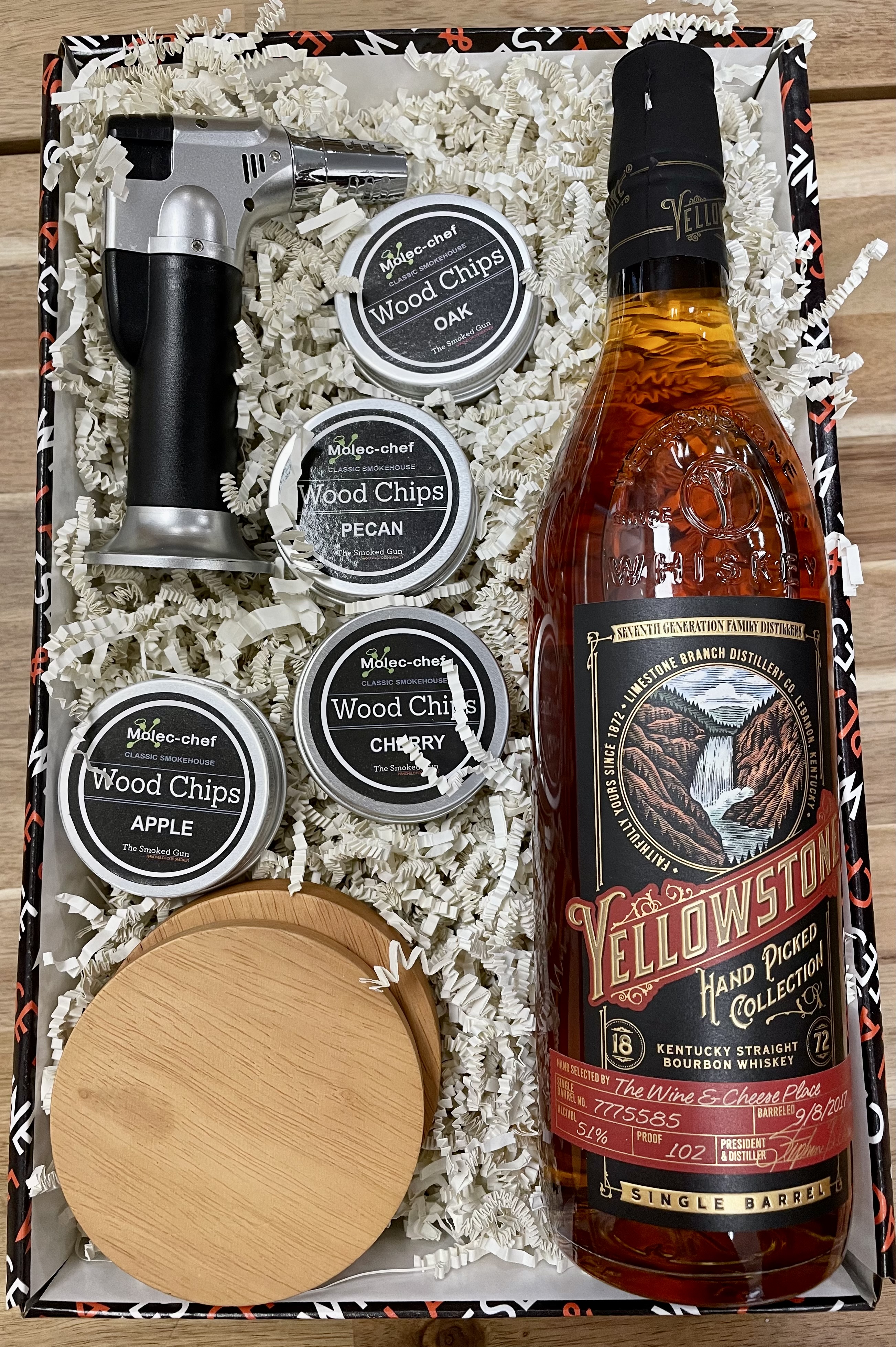 The perfect gift for the bourbon and cocktail lover. This gift comes with one (1) bottle of our store pick single barrel Yellowstone Bourbon PLUS a cocktail smoker kit!