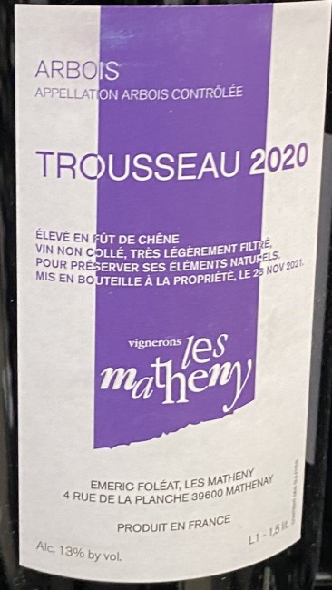 Arbois Trousseau: Les Matheny’s Trousseau is a brooding, serious beast, bristling with energy and thickly textured. Its brash, iron-inflected nose erupts from the glass like a missile, with pitch-black, spice-drenched fruit battling for attention with the wine’s core of mineral-tinged leather and black pepper. Not for the faint of heart, this is a profoundly structured, ruggedly tannic wine that seems to demand cellar time, but—as with the atavistic, rough-hewn Bandol of Chateau Pradeaux—these are honest, proud tannins that are somehow charming despite their intensity.
